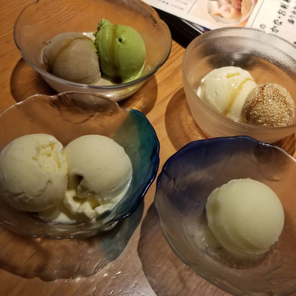 バニラ、抹茶、ほうじ茶、そこにゴマ団子などなど。