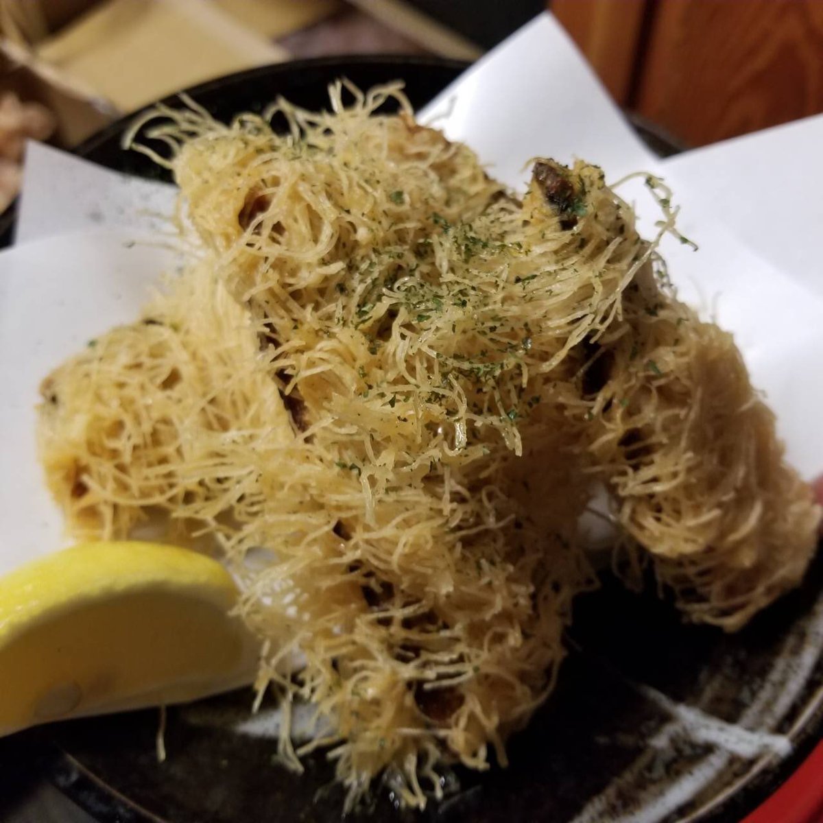 ちょっとだけちょっとだけ、オシャレっぽく、カダイフという麺で秋刀魚を巻いて揚げてみました。